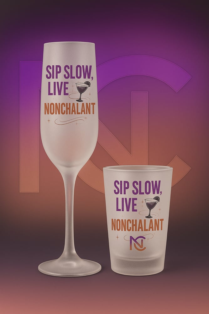 Elevate every toast with The Signature Sip Set — where elegance meets attitude. Featuring our exclusive “Sip Slow, Live Nonchalant” design in luxe rose gold and rich purple, this premium frosted set includes a champagne flute and matching shot glass that redefine what it means to sip in style.